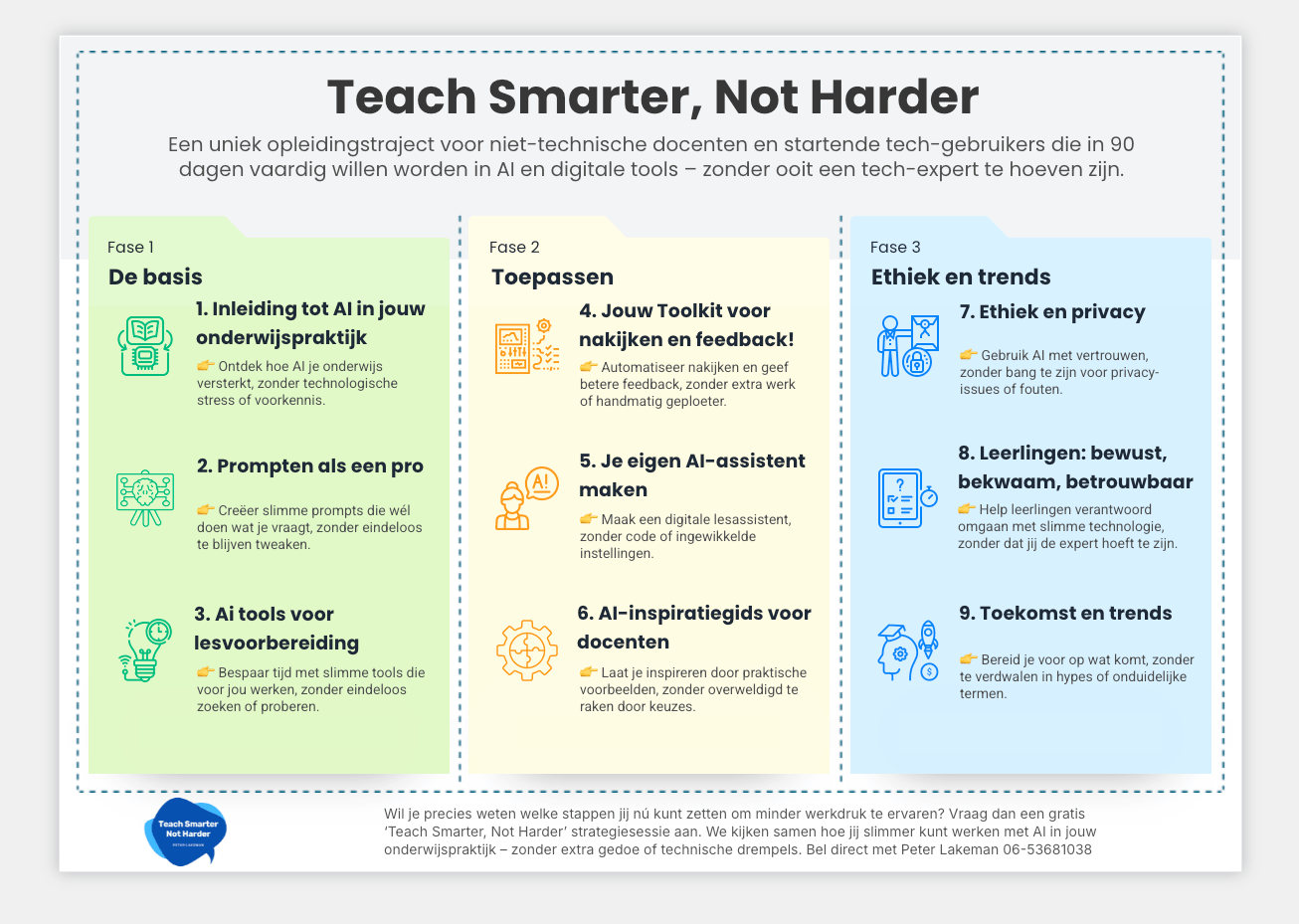 In dit traject neem ik je stap voor stap mee van onzekerheid en losse experimenten naar zelfverzekerd en gestructureerd werken met AI in je onderwijspraktijk – via drie duidelijke fases: De basis, Toepassen en Ethiek & trends.