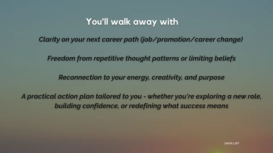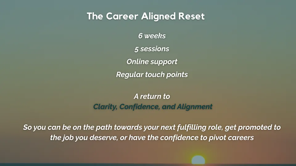 A powerful return to clarity, confidence, and alignment. This is a 1:1 coaching experience for corporate professionals who are ready to stop overthinking and start living and working in alignment with who they really are. You’ll walk away with: - Clarity on your next chapter - Freedom from repetitive thought patterns or limiting beliefs - Reconnection to your energy, creativity, and purpose A practical action plan tailored to you — whether you're exploring a new role, building confidence, or redefining what success means What’s Included: 5 x 30min private 1:1 coaching sessions Slack access for regular communication and checkins Optional guided meditations or breathwork Bonus exercises and content from my digital library Your Investment: £1,111 Payment plan: 2 x £575