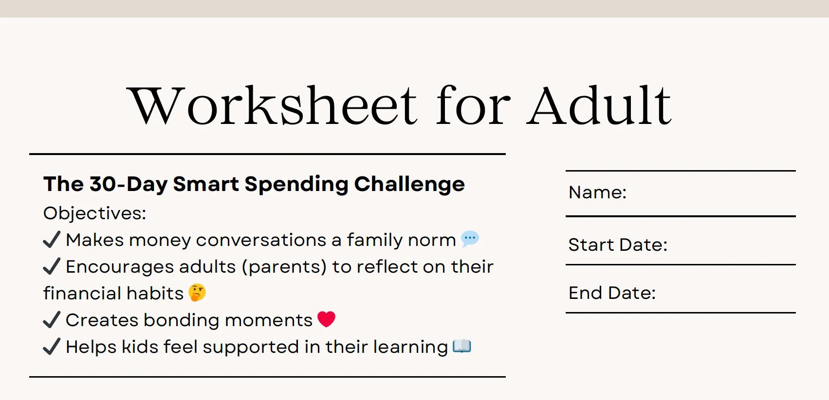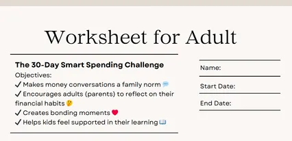 The adult worksheet is designed to guide parents or guardians in supporting their child's journey through the 30-Day Smart Spending Challenge. It encourages meaningful money conversations at home, helps parents reflect on their own habits, and creates a bonding opportunity where learning about finances becomes a shared experience. By using the worksheet, parents become active role models, helping their child build healthy money habits that can last a lifetime. Remember, financial literacy doesn’t start in schools—it starts at home.
