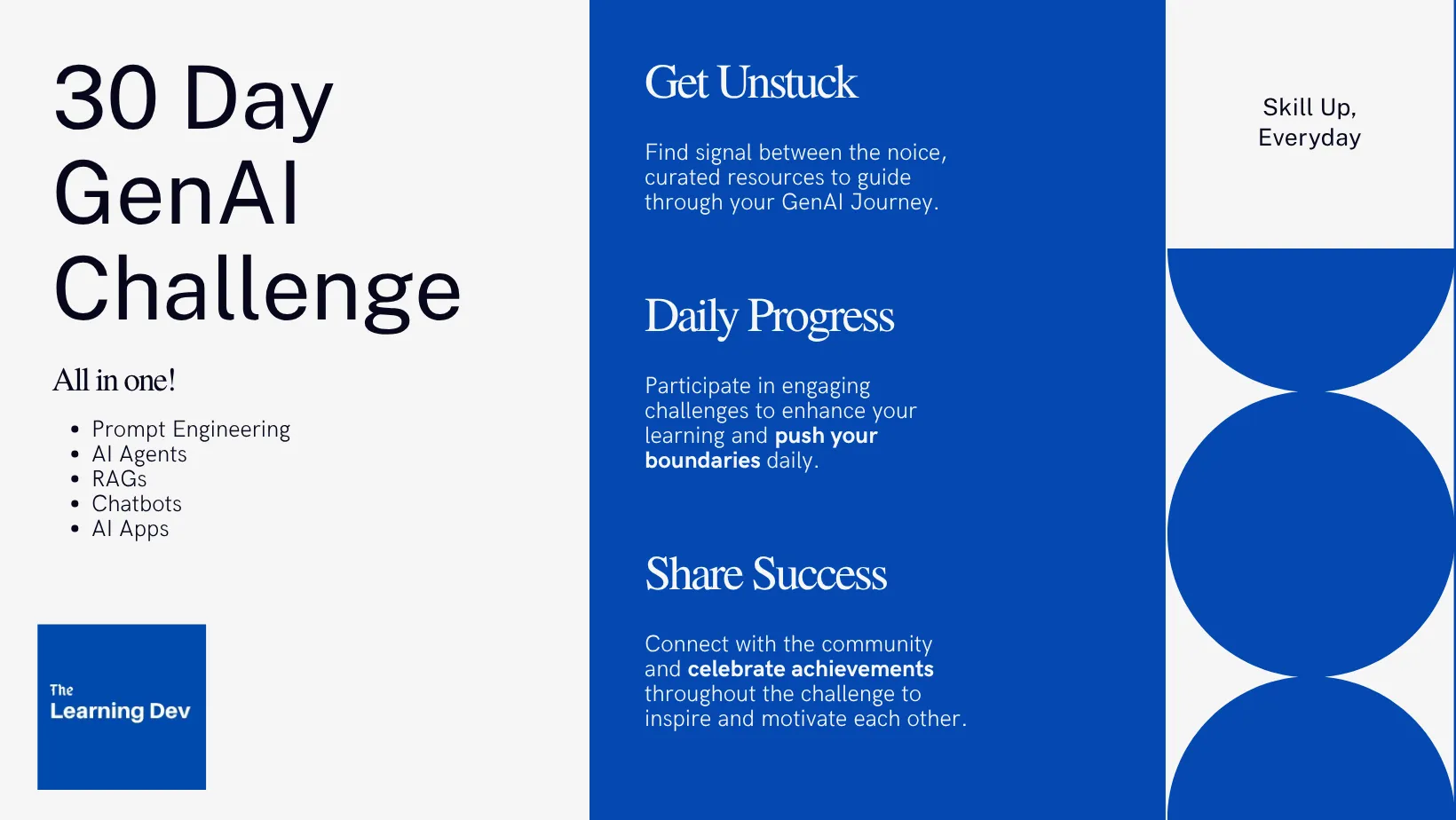 Don't worry—this 30-day immersive challenge is designed to equip you with practical skills and a deep understanding of Generative AI. By the end, you'll be able to apply AI to your own use cases, whether it's building a chatbot or an agent or automating tasks with a script.