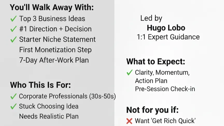 In this 75-minute 1:1 Turning Point Sprint (Google Meet), I’ll help you choose a business direction that fits your real life: your skills, your schedule (5–8 hours/week), and what people actually pay for.