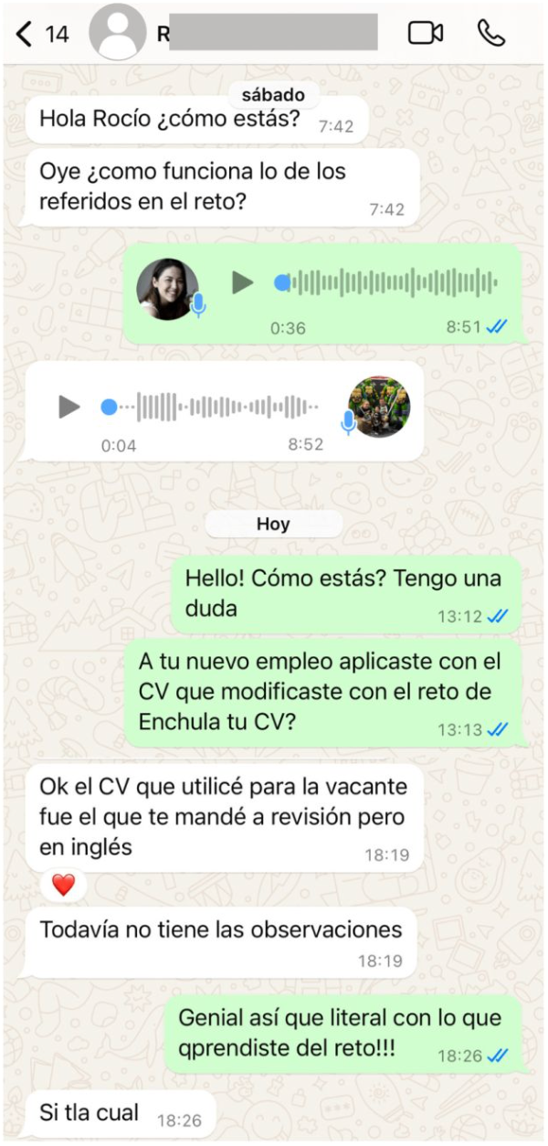 Cada día recibirás un audio o un video informativo que te permitirá realizar la tarea del día. Al finalizar la 5 tareas tendrás un CV que sí te haga justicia listo para enviar.