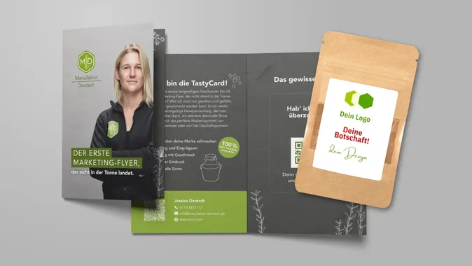 - 250 individuell gestaltete TastyCards – physische Klappkarten mit integriertem Gewürz und passendem Briefumschlag