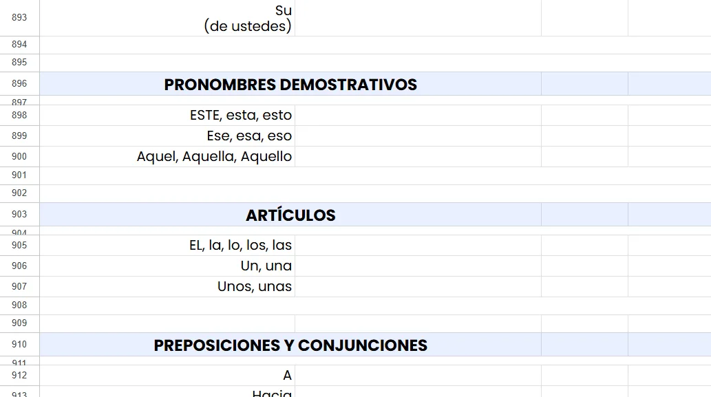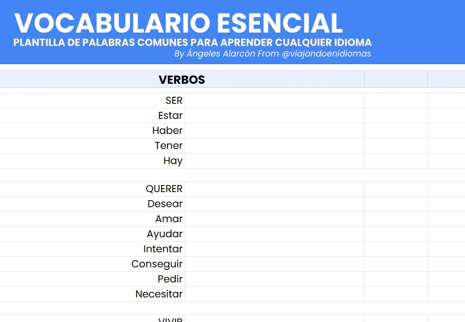 ✔️ Una plantilla editable (en Excel, Word, PDF y Google Sheets) con las palabras más comunes en español que funcionan como puente hacia cualquier lengua.