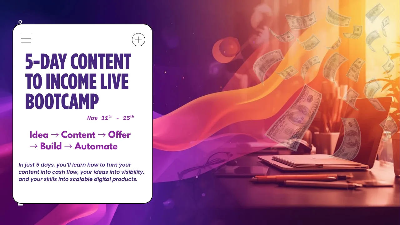 In just 5 days, you'll learn how to turn your content into cash flow, your ideas into visibility, and your skills into scalable digital products.