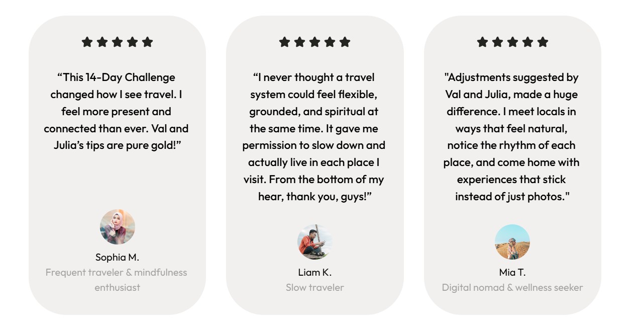 The challenge ends, but the way of traveling stays with you. There are no upsells hidden inside. No pressure to “optimize” yourself. Just a clear invitation to travel with more depth and less friction.
