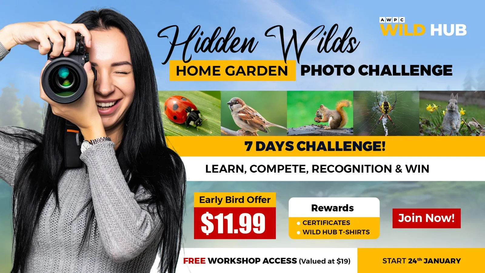 Discover the beauty of wildlife right outside your door! In this 7-day challenge, youāll capture wildlife, including birds, insects, and other species that thrive in your garden or nearby surroundings. With checkpoints, resources, and a final online workshop, this challenge helps you sharpen your skills, celebrate nature, and share your story with a global community.