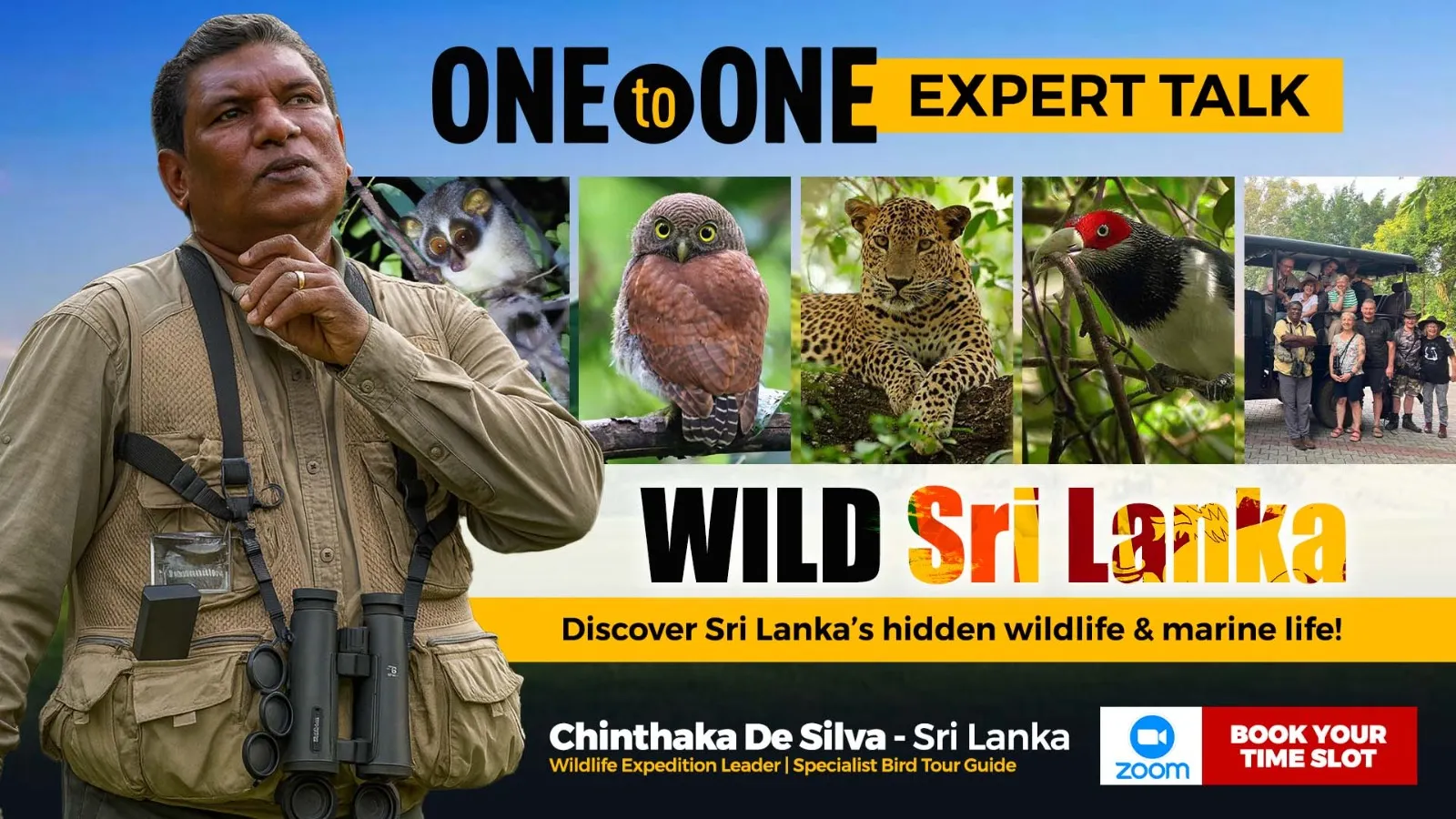 Chinthaka leads international tours showcasing Sri Lanka’s rich wildlife — from elephants and blue whales to leopards, dolphins, lorises, and rare night mammals.